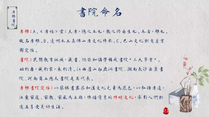 ? ?【孝根書院】以琴、棋、書、畫、茶和漢文化元素為底色,以弘揚孝道,注重家庭、家教、家風(fēng)為主線,傳播優(yōu)秀的傳統(tǒng)文化,導(dǎo)引人們創(chuàng)造并享受美好生活。?